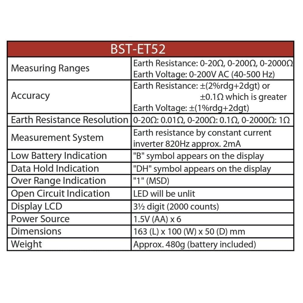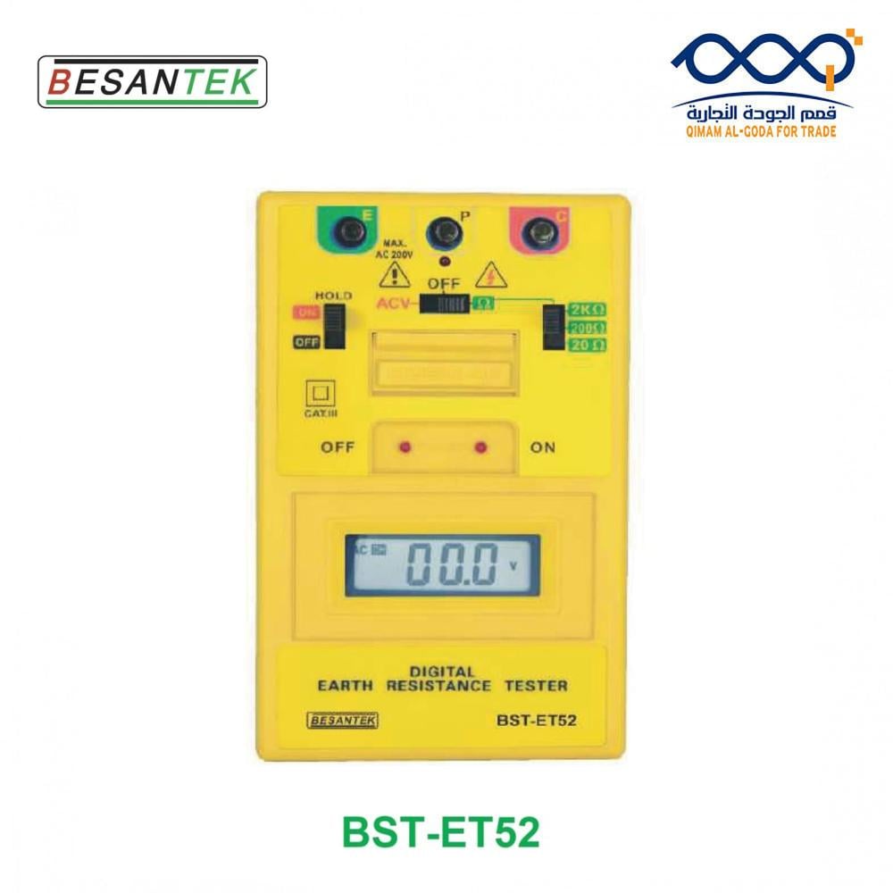 يستخدم جهاز اختبار مقاومة الأرض BST-ET52 من Besantek لقياس أوم تركيبات التأريض الأرضي للمباني (السكنية والمكاتب والمعامل والمستشفيات) وغرف خوادم الكمبيوتر والمنشآت العسكرية والمواقع الخلوية وأبراج الراديو والكابلات وما إلى ذلك. يتم استخدامه لتحديد ما إذا كانت الأرض أو الأرض موصلًا جيدًا للكهرباء .