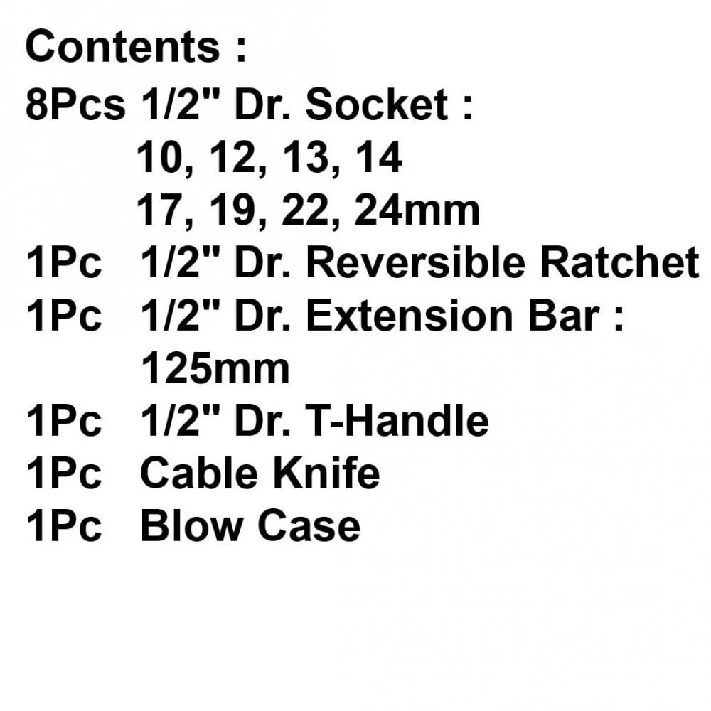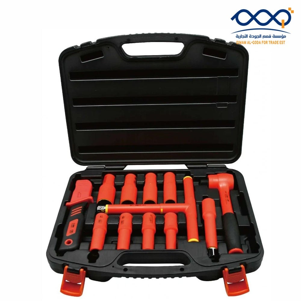 - يتكون طقم العدة من 13 قطعة مختلفة بمقاس 1/2 بوصة معزولة لتوفير الأمان عند استخدامها مع أسلاك كهربائية ذات جهد عالي .