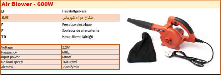 منفاخ هواء كهربائيالفولطية 220vالتردد 60HZالقدرة 600Wالسرعة 1600R/MIتدفق الهواء 2.8m³/minرقم المنتج ATF-33634