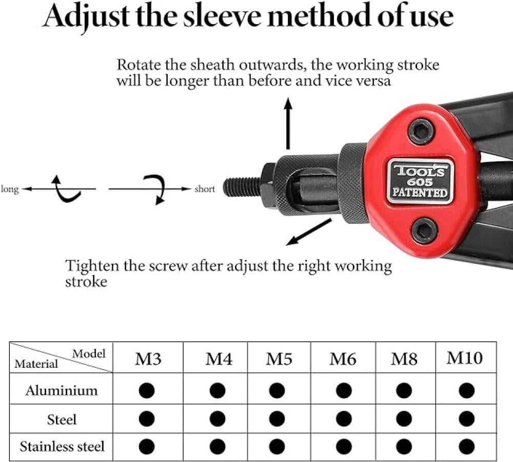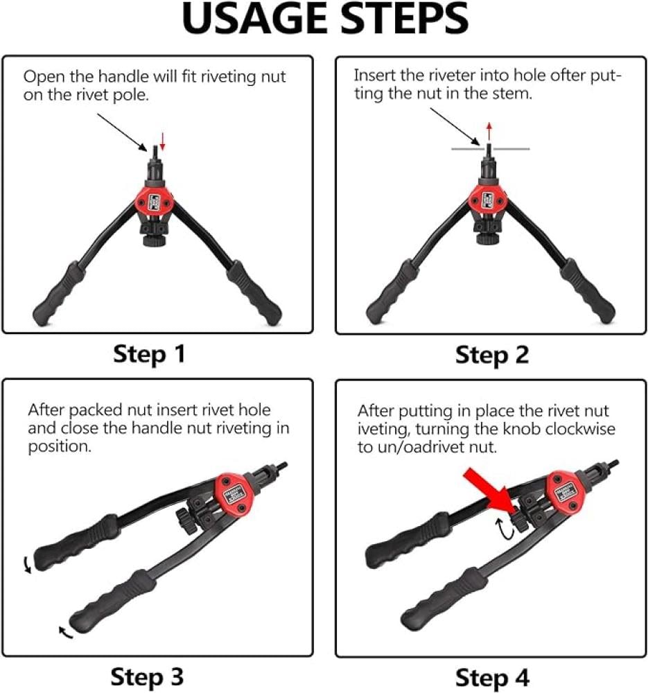 تقدم ماكينة برشام يدوية مجموعة من الأدوات التي يستخدمها العمال لتثبيت البرشام. يتيح لكم الحصول على الأدوات المطلوبة بسهولة وسرعة، بالإضافة إلى صواميل: (3-4-5-6-8-10-12) MM.