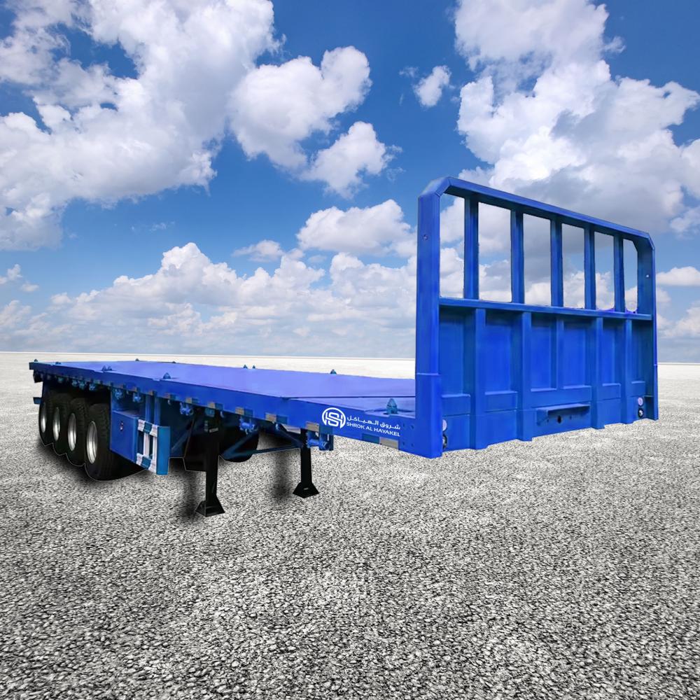The 3-axle sideless flatbed is constructed entirely of high-strength, lightweight steel. This makes it stronger and lighter than conventional flatbed trucks made of other materials. It can be customized to accommodate a payload of 30 tons and is suitable for carrying containers and loose cargo. It features a sturdy base and legs to separate the towing head from the flatbed.