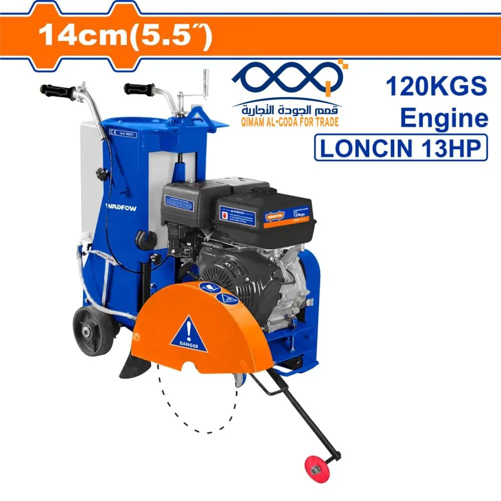 The Wadfow WQF2A16 floor saw is a powerful gasoline-powered tool designed for precise cutting in various construction projects. It features a powerful 9.6 kW (13 hp) motor that ensures reliable performance for heavy-duty tasks. This floor saw offers a cutting depth of up to 14 cm (5.5 in), allowing you to handle thick concrete slabs with ease. With a blade size ranging from 30 cm to 45 cm (12 to 18 in), it accommodates various cutting applications. The saw includes a manual push mechanism and a handle rotation for depth adjustment, providing users with precise control and comfort during operation. Equipped with a 35-liter water tank, it ensures efficient cooling and dust management, while the 2.8-liter fuel tank supports extended use without the need for frequent refueling.